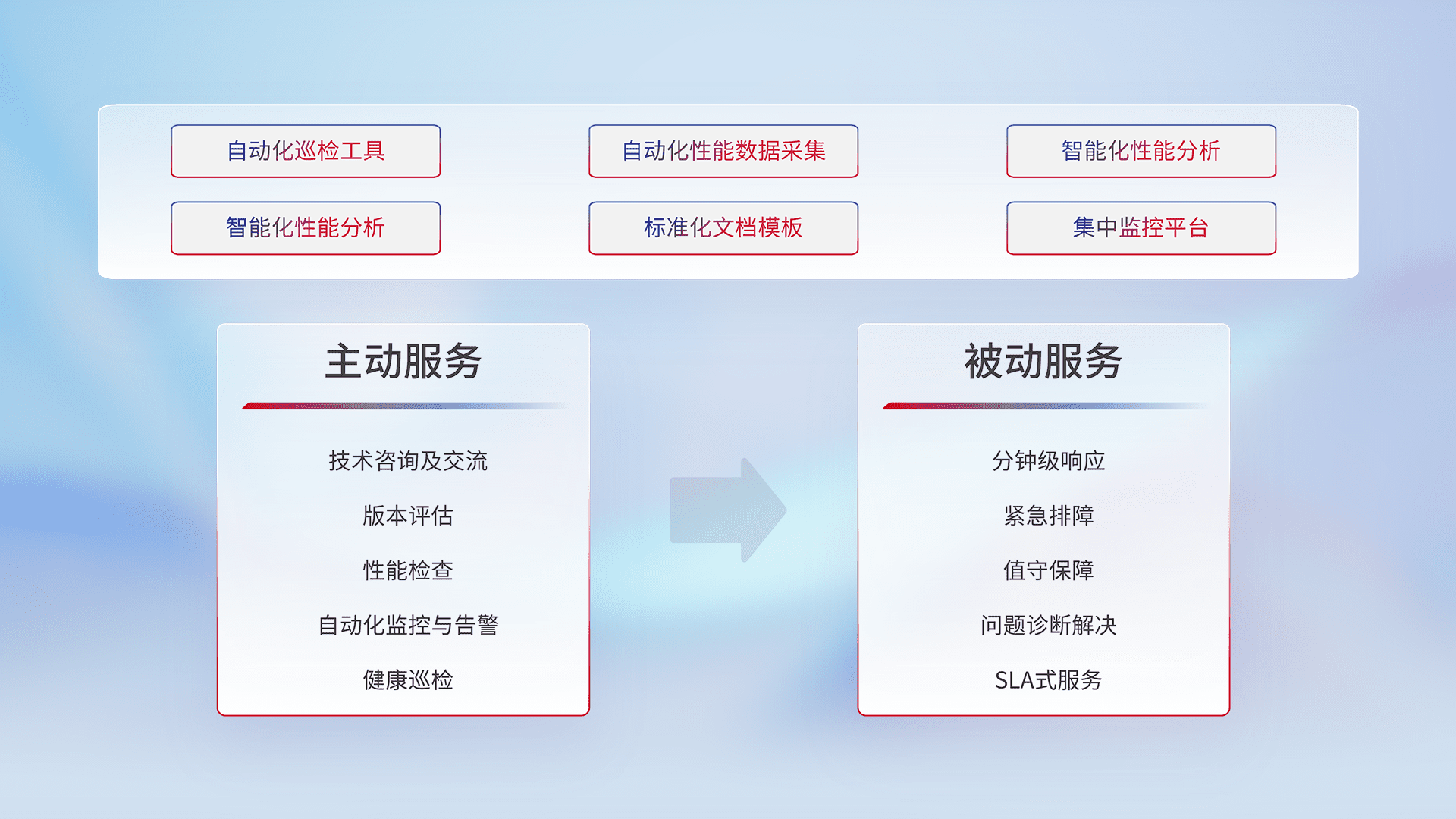 智能化工具和标准化文档,,保障服务质量,,,,提供主动服务(包含技术咨询、、、、版本评估、、、、性能检查、、、、自动化监控与告警、、、健康巡检)和被动服务包含(分钟级响应、、、、紧急排障、、值守保障、、、问题诊断解决、、SLA服务)。。。